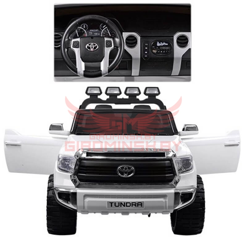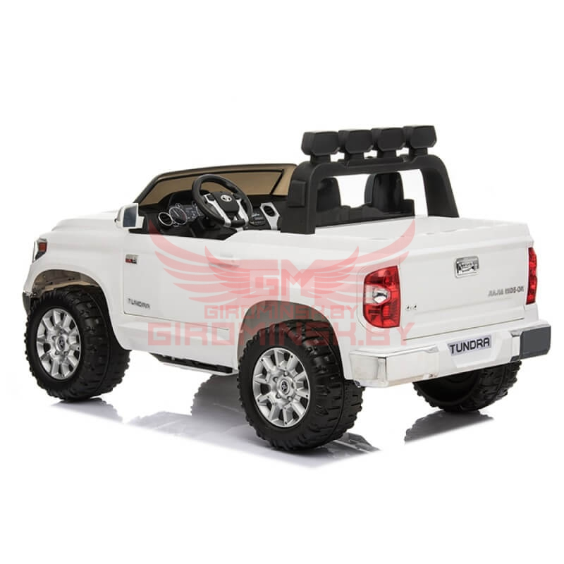 Детский электромобиль RiverToys Toyota Tundra JJ2255 24V лицензия цвет белый двухместный. Аккумулятор 24V/7АН. Редуктор 2*24V. Световые эффекты: диодные огни, фары передние, задние фары, прожектора (работает от батареек - 4 шт АА). Звуковые эффекты: музыкальный руль (работает от батареек - 2шт АА). Пульт управления: нет. Колеса: EVA резина. Скорость: 3-7 км/ч, две скорости вперед, одна назад. Сидение: кожаное, двухместное, ремень безопасности полосной (2 шт). Включение: кнопка. Открываются двери, багажник. Медиа-панель: microSD-вход, USB-вход, mp3-вход, индикатор заряда батареи.
