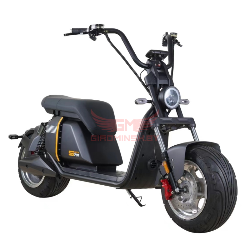 Казалось бы – что ещё изобретать? И вот очередной брутальный электрический чоппер с совершенно новым дизайном. Отличный от других пластиковый обвес, широкая цветовая гамма, удобное двойное сидение мотоциклетного типа обтянутое практичной водоотталкивающей экокожей со вставкой в цвет кузова, грязевой отбойник над задним колесом, расположившаяся в специальной нише под сидением съёмная Li-ion аккумуляторная батарея ёмкостью 45 Ач – это лишь малая часть отличий S701 от других моделей самокатов форм-фактора ситикоко. Следует отметить, что производители поработали не только над дизайном этой модели, но и значительно улучшили основные узлы и агрегаты. У SMD S701 новая сверхпрочная рама и руль выполненные из толстостенных труб с антикоррозийным покрытием. Широкие бескамерные пневматические шины с направленным рисунком протектора надетые на массивные 12-тидюймовые литые диски имеют округлый профиль, что позволяет легко входить в повороты и делает Ваш самокат более маневренным по сравнению с аналогичными моделями от других производителей. Не маловажным отличием электрического чоппера S701 является полная заводская гидроизоляция. В модели впервые установлен высокоскоростной евроконтроллер, который разместился в боковой нише под пластиковым крылом и полностью защищён от попадания влаги. Широкие колёса вместе с грамотно смонтированной в центральной части аккумуляторной батареей обеспечивают правильную развесовку скутера, что придаёт устойчивость, как во время движения, так и во время остановки.