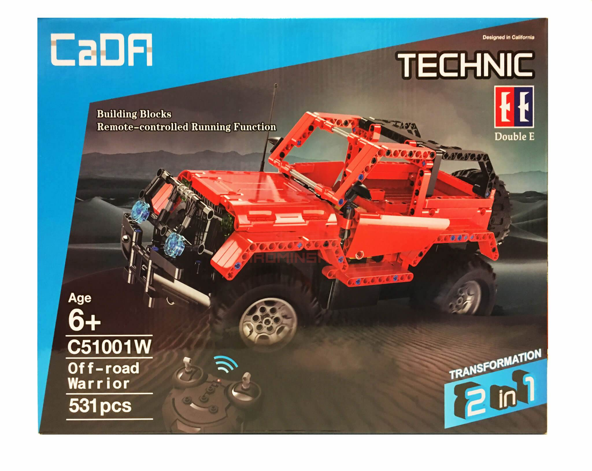 Модель C51001W – набор для сборки джипа, состоящий из 531-ой детали. Сборным является не только корпус игрушки, в комплект поставки также включены: электрический двигатель, колеса с резиновыми протекторами, плата с микроконтроллером, аккумуляторная батарея. Также пользователю предоставляется зарядное устройство и пульт радиоуправления. Конструкторы CaDa разрабатываются специально для детей, детали легко стыкуются друг с другом, собранный корпус достаточно прочный и рассчитан на активную эксплуатацию.