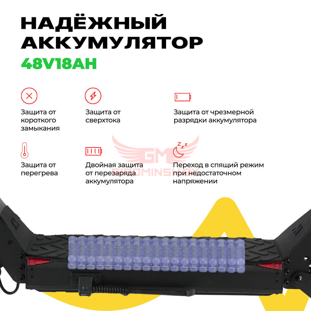 Электрический самокат Мидвей Амикс заднеприводный. Оборудован мотор-колесом номинальной мощностью 1000W, благодаря чему транспорт разгоняется за считанные секунды до 50 км/ч. Такого двигателя хватит, чтобы забираться в горки под углом 20 градусов. Аккумуляторная батарея встроена в деку и имеет стандарт защиты от пыли и влаги IP54. Ёмкость АКБ 48V 18Ah позволит проехать расстояние до 55 км на одном заряде. Время полного заряда батареи 4-6 часов.